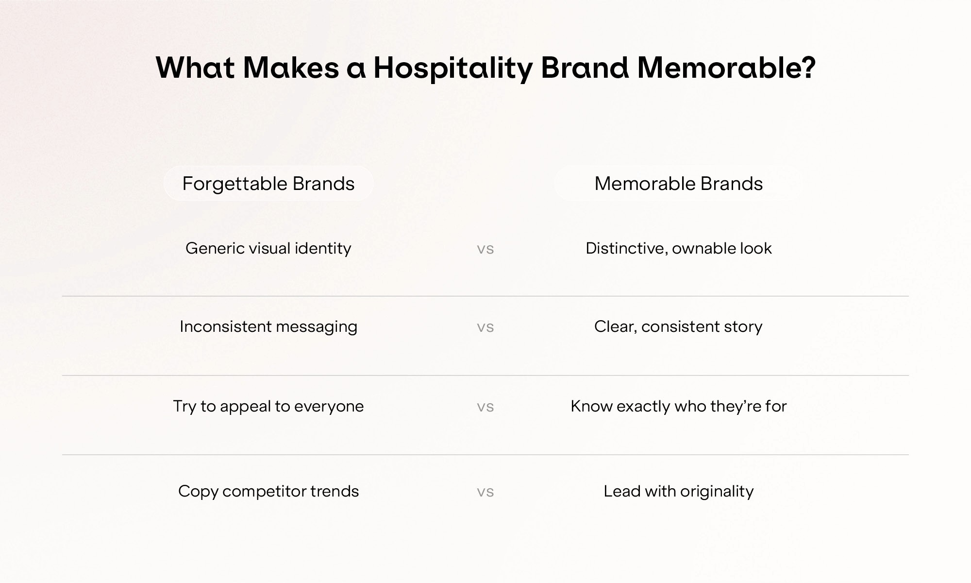 Start with positioning. Before you think about logos or colour palettes, get clear on who your ideal guest is and what you genuinely stand for. Not "everyone" and not "great service." Something specific and ownable.