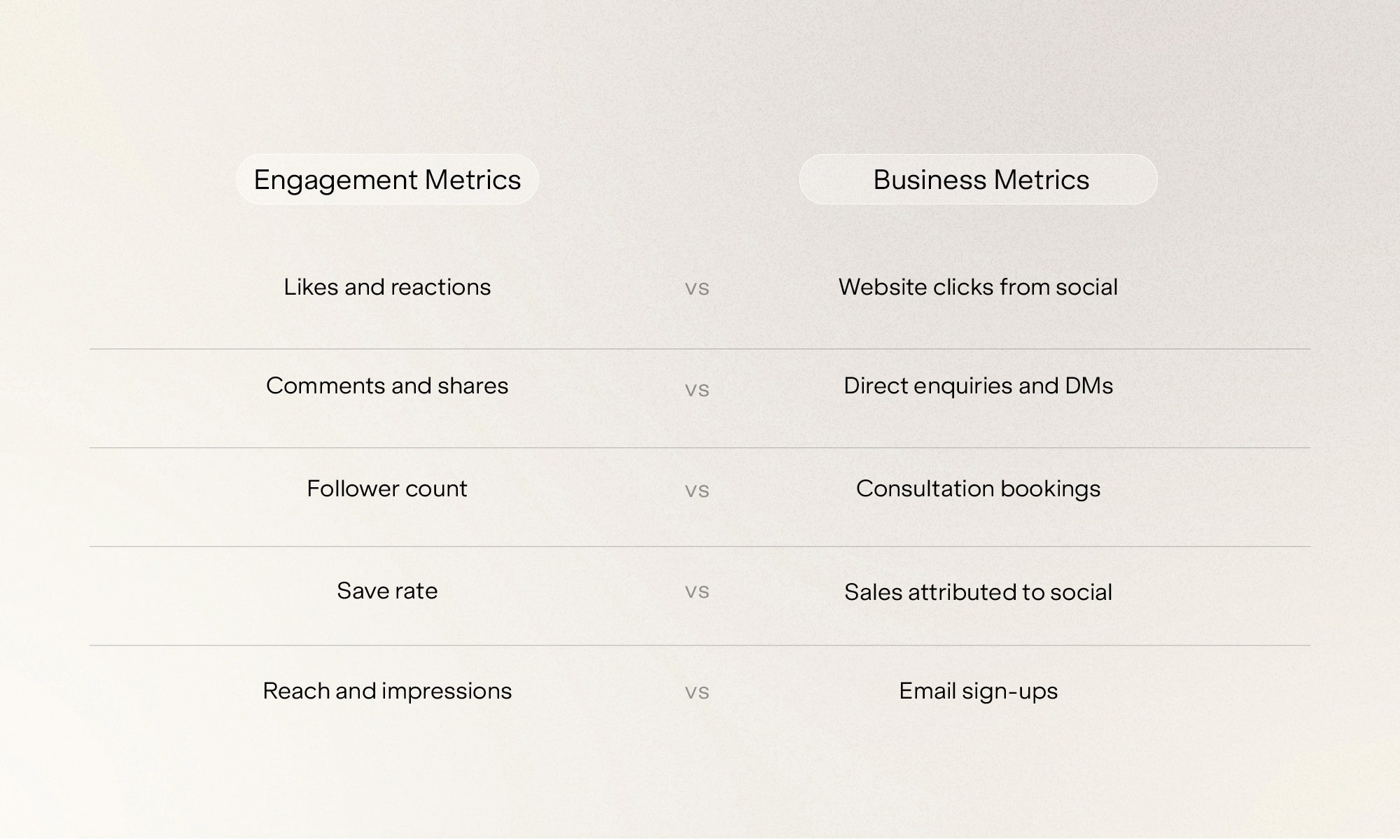 Engagement metrics measure how people interact with your content. Business metrics measure how that content drives actual revenue. A post with 500 likes and zero enquiries isn't working for your business. It's working for Instagram's algorithm.